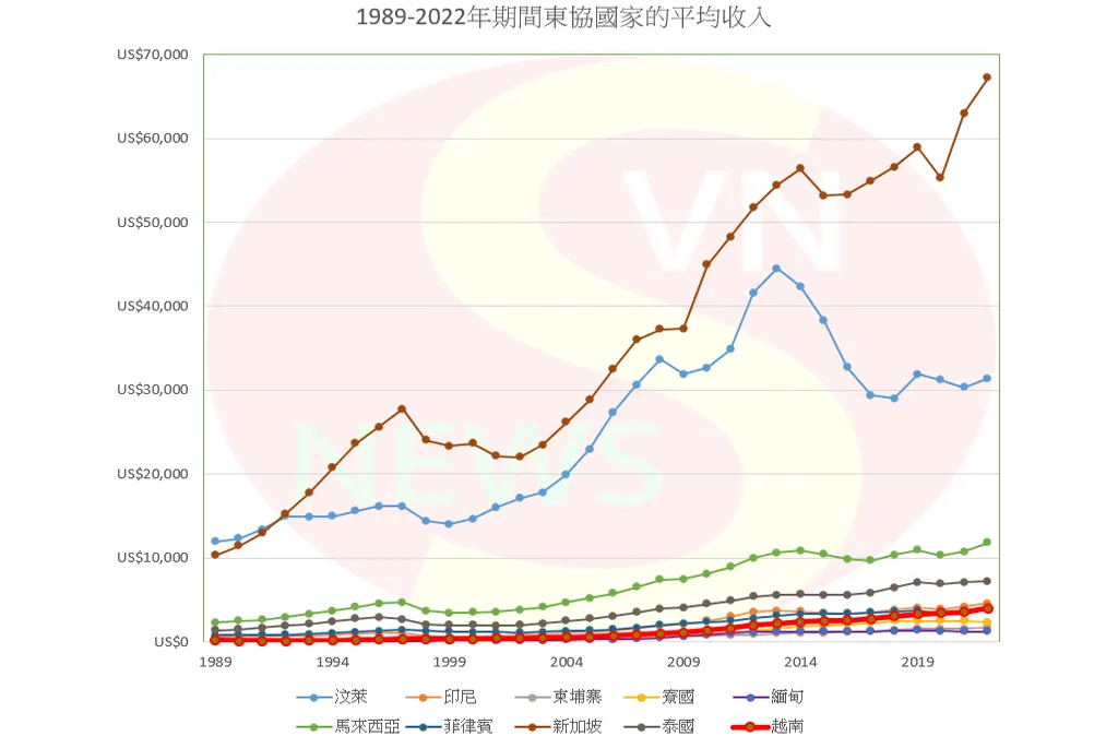 35年後,越南的平均收入成長了近26.7倍。其他國家也有所提高,但速度較慢,如:寮國(14.4倍)、新加坡(9.2倍)、印尼(9倍)、泰國(8.4倍)、菲律賓(6.37倍)、馬來西亞(6.16倍)、柬埔寨(5.84倍)次)和汶萊(2.62 倍)。